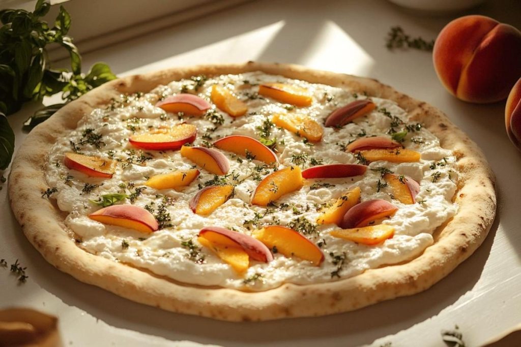 Imaginez-vous attablé dans votre pizzeria préférée, scrutant la carte des desserts après avoir savouré votre margherita habituelle. C’est exactement ce que je m’apprêtais à faire quand mes yeux se sont posés sur cette création inattendue : une pizza blanche aux pêches et burrata. Cette combinaison audacieuse entre sucré et salé m’a immédiatement interpellé, remettant en question tout ce que je pensais savoir sur l’art de la pizza.